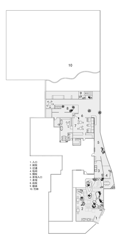 当游览者从前院步入后院竹林,所经历的游玩体验,是一场从古典园林所代表的精致典雅,迈向田园牧歌式自然空间的过渡;是从前院所蕴含的文人雅趣,转向后院竹林所独有的质朴野趣的转变过程。于此,场地所流淌的生命活力才是人能够获得精神愉悦的来源。