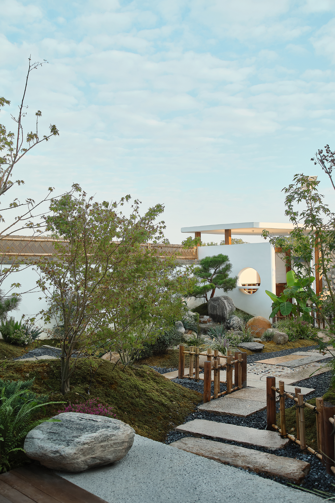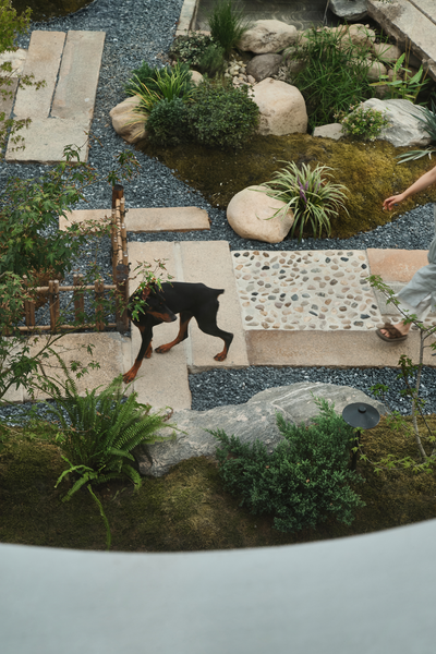前院山门内外入口错开,形成入门遮蔽转角。进门左侧为喝茶凉亭,它与山门连成一高一低的节奏;右侧置入松石水景,将天光水光一并纳入。园林的灵魂在于它是按照人的意愿,庇护最大限度的宁静。在这个咫尺方圆内,将自然缩小到适宜人体的尺度,它便成为抵御现代生活侵蚀的庇护所,从而与那些寻求与自然相连接的人们共通。