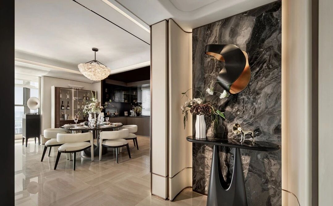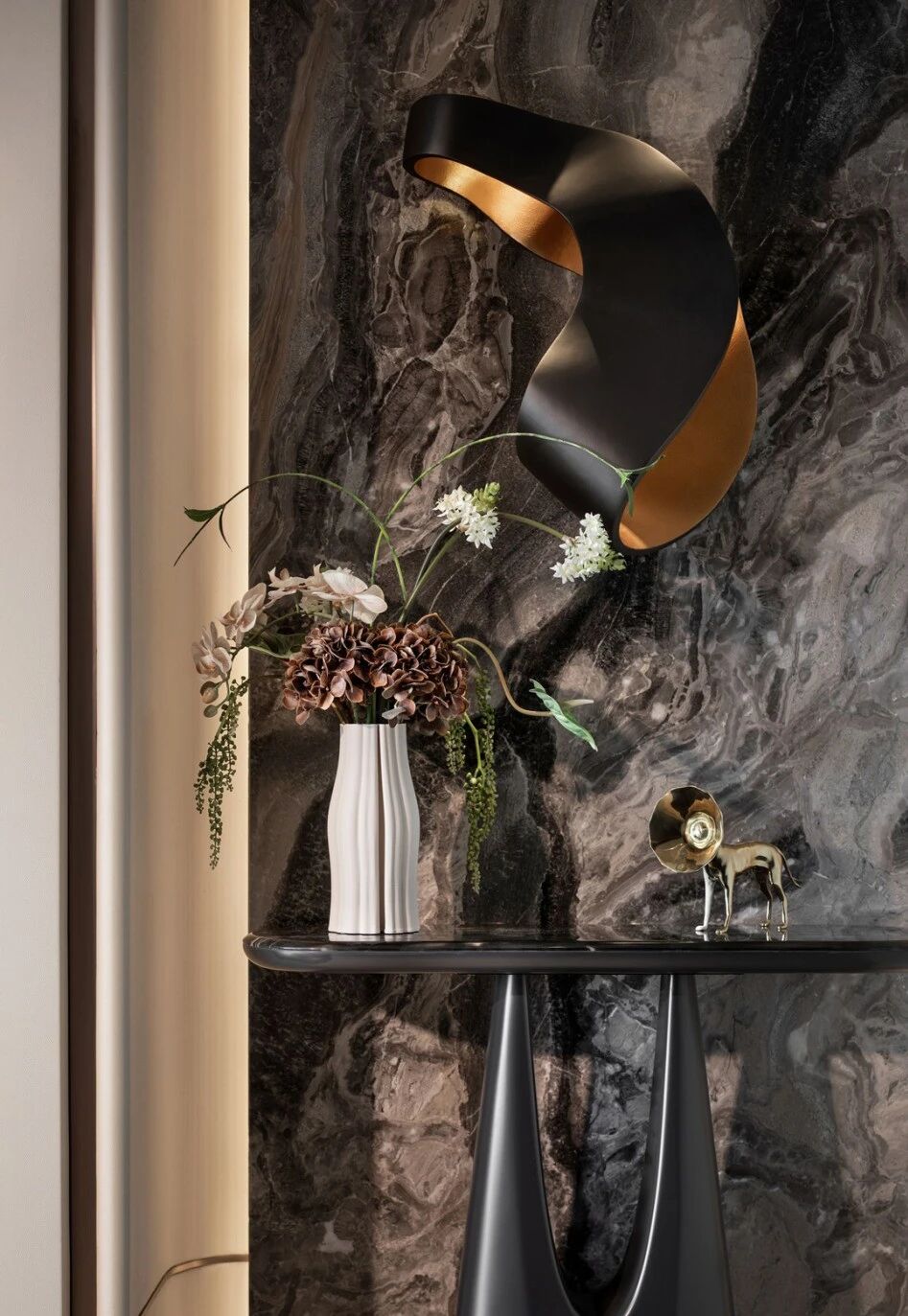 运用纯粹大理石打造玄关区域,在灰色衬托中彰显迂回灵动 的肌理,由此形成内外联动的经典标志。