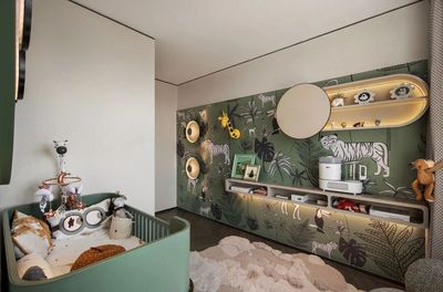 小孩的卧房和其余卧间形成较为明显的对比。绿丛林主题由壁画巧妙呈现,以云朵般的地毯将空间“拥抱”勾勒独特的归属柔美感。