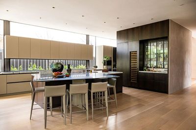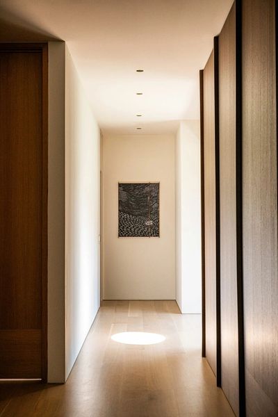 功能布局也是该住宅设计成功的关键。住宅一层从北向南延伸,打造出多样化的空间形态:户外起居区与厨房、餐具室无缝衔接;半下沉开放式客厅与餐厅区域通透开阔;装饰精致的走廊连接着主卧套房、化妆间、办公室、瑜伽室、影音室、换衣间与洗衣房。一面设计成 “跑道” 形状的橡木饰面墙不仅规整了空间布局,还巧妙地将住宅核心区域的私人功能空间隐蔽起来。