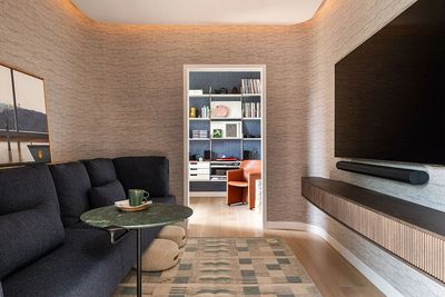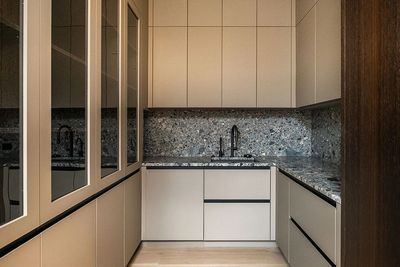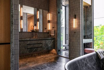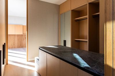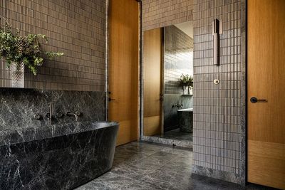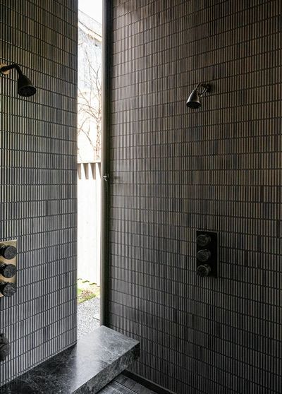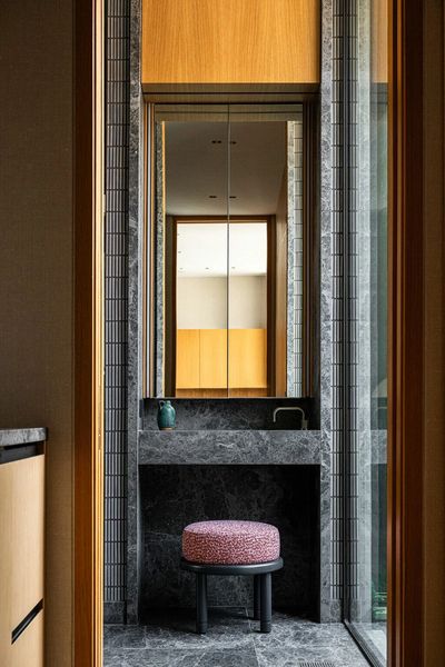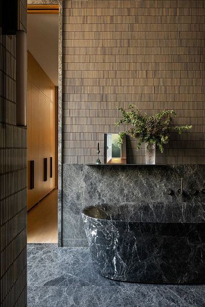 520 平方米的室内空间中,色彩层次丰富且过渡自然,色调柔和又不失层次感。塞波大理石(Ceppo marble)地面、烟熏橡木橱柜、暖灰色层压板,以及与建筑石材色调匹配的灰泥材质,在精心筛选的色彩范围内营造出丰富的深度与变化。主卧套房采用天然白橡木搭配深蓝色日式瓷砖与冰岛大理石,将温暖质感与深邃阴影巧妙融合;浅色橡木地板与深色元素形成对比,确保整体空间氛围均衡协调。