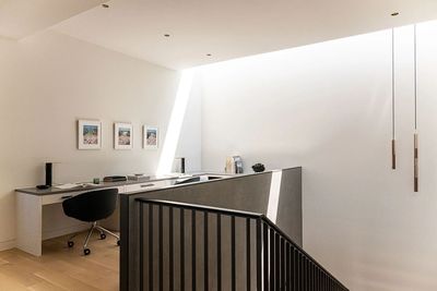 住宅二层以一个可俯瞰树梢景观的家庭活动室为中心,周围分布着四间儿童卧室(均带独立卫浴),还配备了另一间洗衣房以简化日常生活。这种布局体现了现代生活理念:公共空间相互贯通,方便家庭聚会;而独立的私密空间则为工作、锻炼或独处提供了安静环境。这样的功能设计表明,该住宅虽从现代主义的开放式布局与中世纪风格的新颖元素中汲取灵感,却针对当下年轻家庭的复杂生活需求进行了灵活调整。