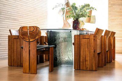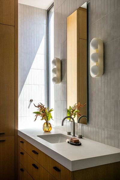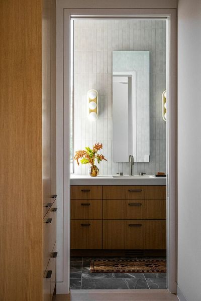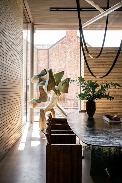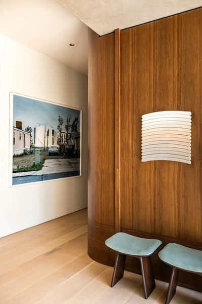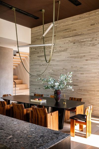 室内陈设进一步深化了现代主义传统与当代审美之间的对话。赖斯并未沿用常见的中世纪现代风格经典家具,而是精心挑选了一系列藏品,将稀有的复古单品与当代设计师的限量版作品巧妙融合。艺术感十足的灯具、雕花木椅与石材餐桌,为室内空间增添了历史韵味与个性魅力,同时与住宅柔和的色调氛围保持和谐统一。每件陈设不仅具备实用功能,更承载着独特的个性,呼应了业主对新颖设计的钟爱。