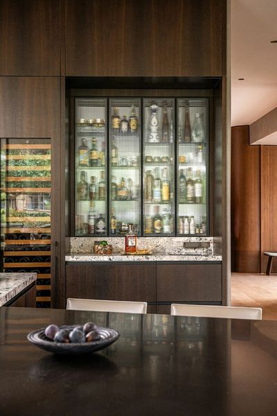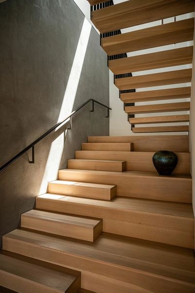 建筑以灰色石灰岩墙面为重要支撑,选用这种材质不仅因其耐用性,更因其独特的层次美感。石灰岩墙面从室外延伸至室内,形成空间的连贯感。大面积玻璃设计让家庭成员与户外环境紧密相连,而木饰面与灰泥材质则柔化了石材带来的硬朗感。