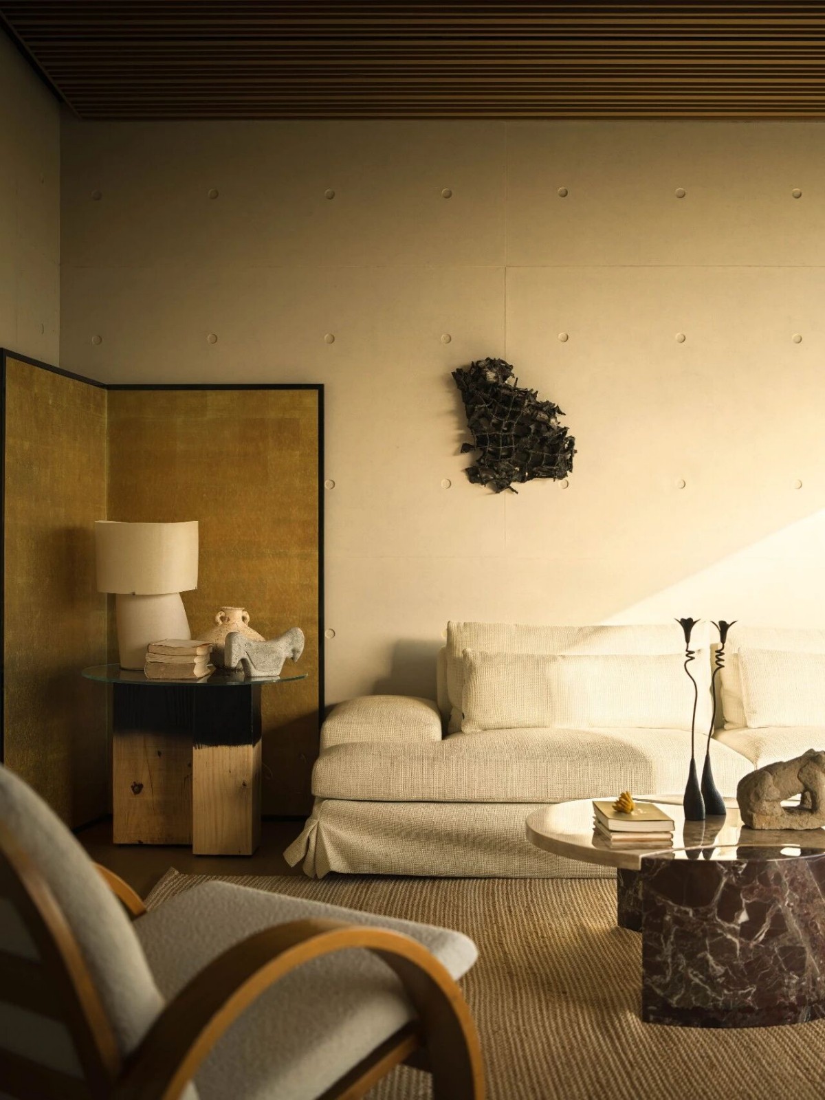 起居室采用光滑的胶合板模板混凝土表面,配合来自Valsad的可持续柚木饰面,狭长窗框取景出外部树影。起居区被划分为两个聚落:一组为定制沙发与Eames椅搭配Flos的Arco 灯;另一组为更正式的布艺灯具与Jaipur Rugs的抽象地毯,营造丰富层次的居家氛围。