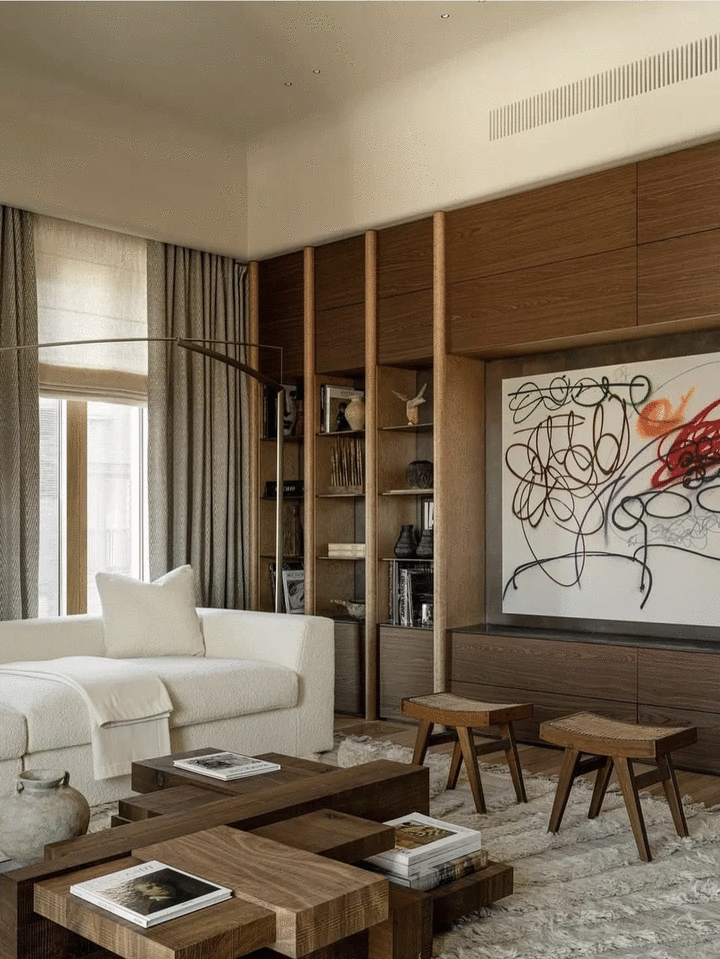 步入这个家,你会首先被那种冷静而自信的都市感所吸引。暴露的金属构件、线条利落的黑色轨道灯,或是局部运用的深色水泥质感墙面,这些经典的工业元素被巧妙地控制在恰到好处的比例。它们并非为了营造冷峻的仓库感,而是作为现代都市生活的注脚,勾勒出空间的轮廓与力量感。与之呼应的是深邃的色调—— charcoal grey(炭灰)、navy blue(海军蓝)或是 espresso(浓缩咖啡色)——它们被用作局部的墙面、家具或装饰点缀,如同画布上沉稳的阴影,让空间显得内敛、深邃且极具现代时尚气质。
