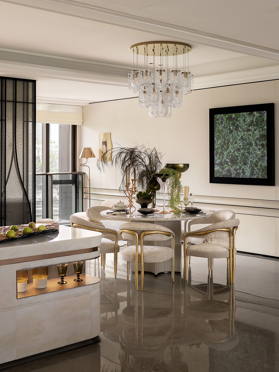 會談小憩的角落,更像一套默契的生活語法。幾何紋樣的座椅與米白色單椅,與淺色石材相互映襯,一冷一暖、一實一柔,清朗鬆弛。