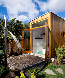Trio of wooden cabins forms Little House on the Ferry in Maine