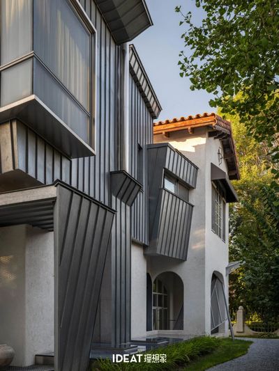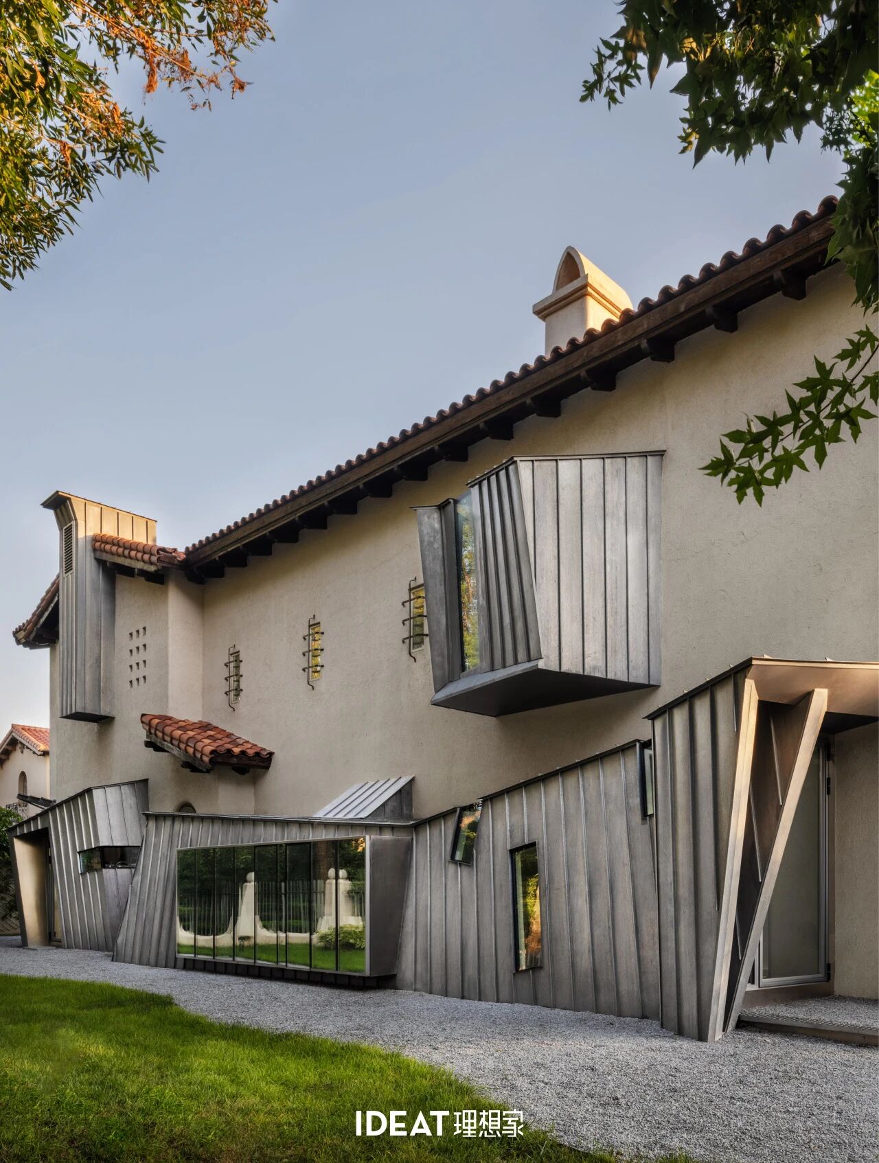 王泉为这所房子取名“叠舍 Mix House”,一名三意,耐人寻味:首先是功能之叠,这里原本只是家人的居住之所,经改造后,新增了地下工作室与社交空间,灵活切换,让一座房子同时容纳多种生活场景;其次是新旧之叠,原建筑的四角坐标得以保留,但嵌入了全新的金属体块,传统灰泥与冷峻钛锌板交融,碰撞出空间交错的立体美感;最后是风格之叠,设计中融入多种风格元素,反差明显,却毫不违和,共同营造出一个丰富而协调的视觉现场。