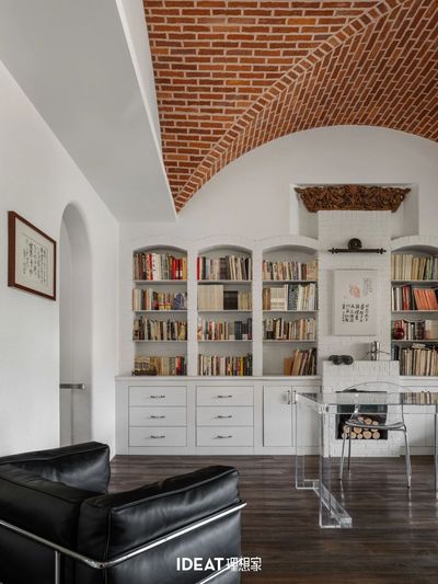 书房内阳光充裕,屋顶采用红砖,地面则选择更深的颜色去平衡房间过亮的问题。屋顶的十字拱致敬欧洲中世纪的教堂建筑中(例如古罗马的巴西利卡式建筑)的经典结构。LC2 扶手椅,勒·柯布西耶,Pierre Jeanneret,Charlotte Perriand 设计(1928年),Cassina 出品。