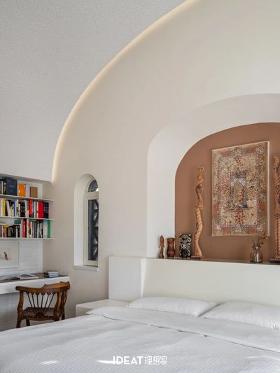 男主人卧室和书房处于同一层,色彩风格一致,且更加简约。在窗户和材质的处理上,延续了王泉喜欢的地中海风格。