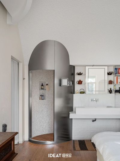 左图:浴室作为房间中的独特存在,采用全金属材质,圆形的空间更利于沐浴习惯,同时整体形态如同天外飞来的“飞船”。床头挂着来自伊朗的纯手工挂毯,床尾的柜子收于德国慕尼黑,不同风格的作品在这个空间里和谐共处。右图:女主人房的一角,摆放着有着 120 年历史的新艺术运动家具,上有云母镶嵌纹路。与卧室的暖色相对比,浴室采用大面积蓝色马赛克铺砖。