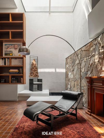 第二宅是王泉的工作室,也是他的图书馆。他格外喜欢其中一个拥有天光的角落,上方的天窗其实是一个鱼池,有水的时候光线效果会更加戏剧。前方LC4 躺椅,勒·柯布西耶,Pierre Jeanneret,Charlotte Perriand 设计(1928年)Cassina 出品。Arco 落地灯,Achille - Pier Giacomo Castiglioni 设计(1962年),Flos 出品。后方摆放有木雕的黑色线条椅子是王泉的设计作品。