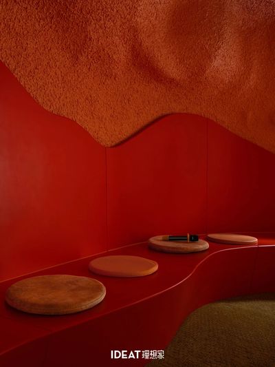 中餐区在设计中被计划为人少时的相聚场所。圆形元素在这个空间被强调。地面的材质采用人工红砖上覆环氧树脂,致敬勒·柯布西耶在 20 世纪 40 年代至 50 年代常用的材料。