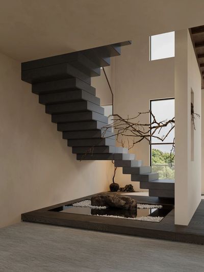 楼梯的台阶是面向室外花园的,不是面向室内的,设计过程中,楼梯的设计做了很多稿的设计,面向室内的楼梯总是显得格格不入,功能上楼梯链接二层的用餐客户,并不常用,这样的设计,让楼梯变成了室内的美观造景,也可以让二层客户下楼看到了美丽的山景,有种不经意的美感;