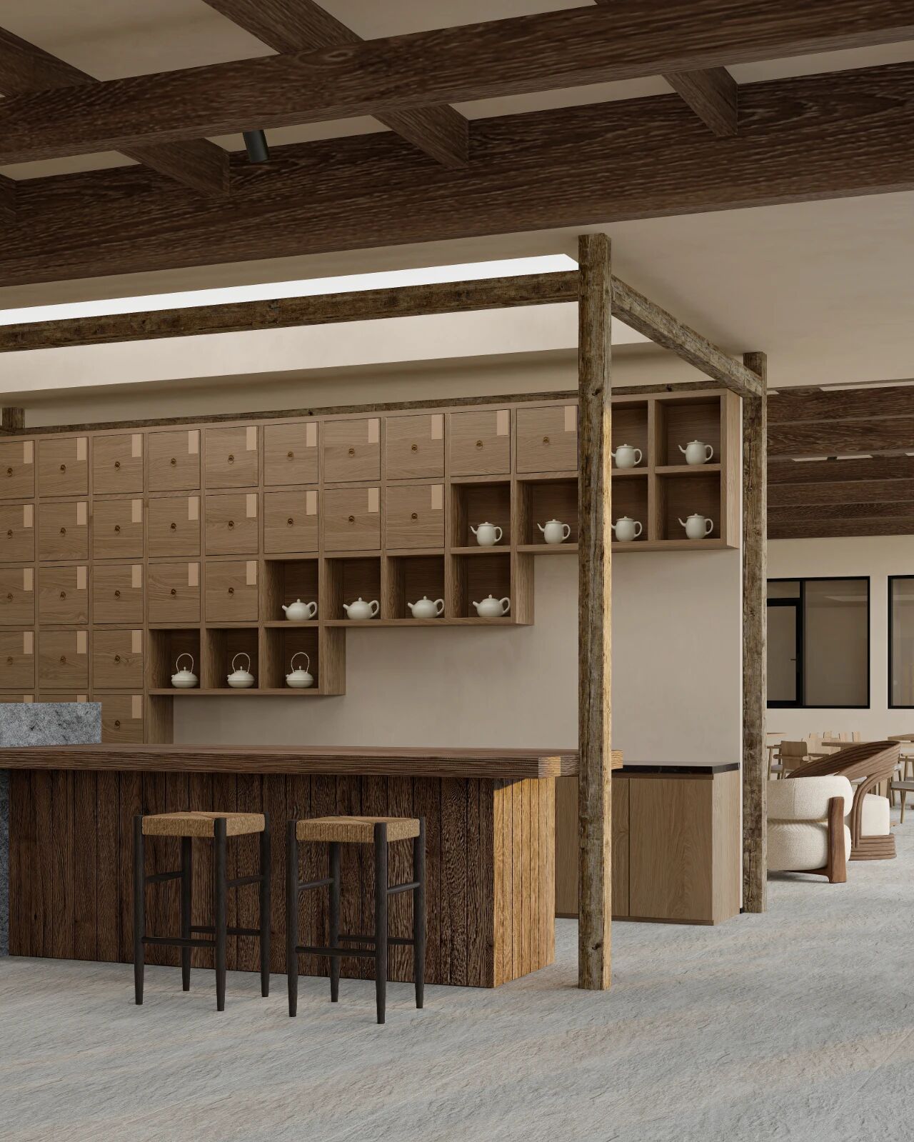 原始的立柱和接待台做链接,放置售卖品,增加业务种类;接待台链接吧台,是闲暇的午后,独自一人感受茶文化的小空间;