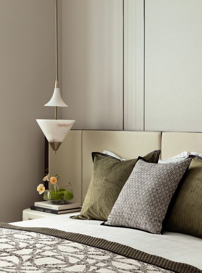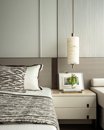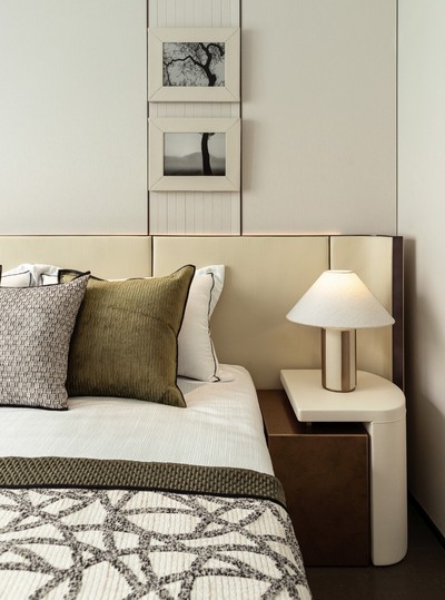 主卧延续整体色调,沉稳的大地色系在光影作用下产生时间流逝的斑驳意味。木质、棉麻等材质来源自然,却亲切、贴合身体,仿佛顺应生活肌理般带出反复接触的日常感。