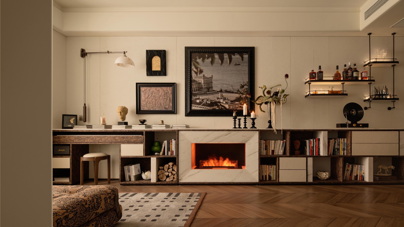 切换到客厅的延伸处,整体布局融入客厅大空间之中,却通过定制通透式玻璃格架与灯光语言自然区隔,既保有私密性,又与整体空间保持视觉与动线的连续,达成“开放中有界,共享中有私”的设计平衡。柔和与自然呼应整体“花园洋房”的空间主旨,使得书房不再只是功能区域,更是一处融合美学与心灵的精神角落。