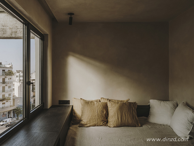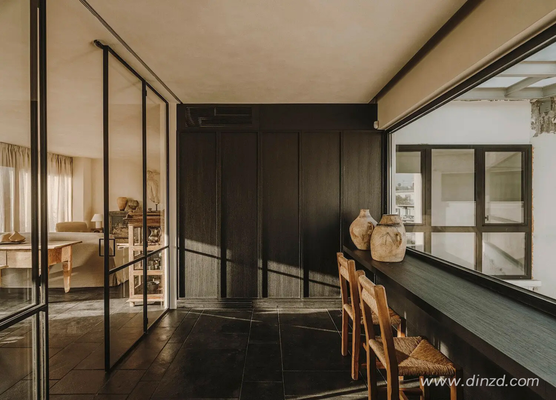 尽管采用开放格局,顶层公寓的材质谱系却以深邃迷人的色调统领全局。“深色系让空间在夏季保持清凉感,并以粗犷的奢华营造 sensual 氛围,”埃瓦阐释道。染色石灰岩墙面、黑石地板与深色木制橱柜构成质感交响,恰似雅典城市肌理的微缩映照。