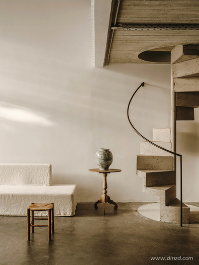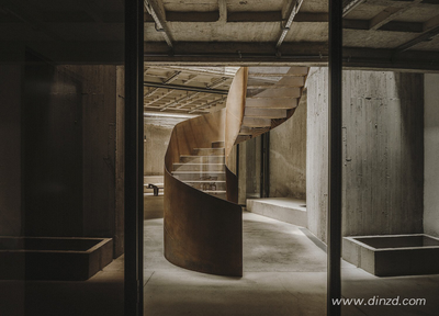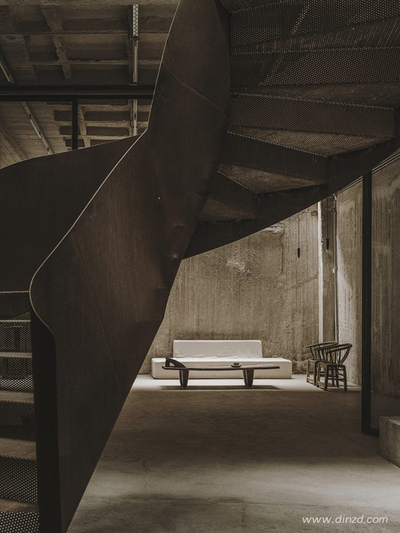 入口区域明亮素净,一座混凝土螺旋楼梯蜿蜒而上,通往夹层办公空间