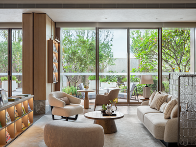 Large areas of wood veneer walls combined with natural light create a sense of tranquility gently wrapped in time. Sunlight pours in through the floor-to-ceiling windows, reflecting on the light-colored fabrics and wooden furniture.
