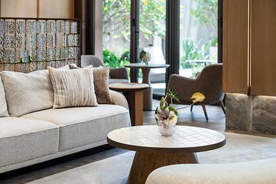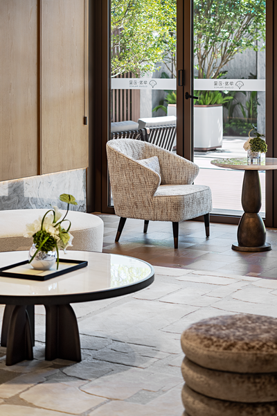 午後的光穿過玻璃帷幕,柔和地灑落在織物與石面上。內外景色在此交融,模糊了邊界,讓洽談區成為自然與人文的緩衝。