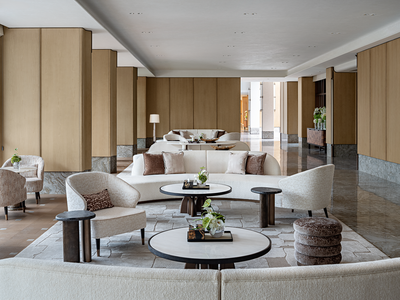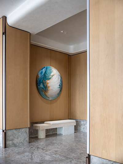 作為會所的序章,前廳以克制的優雅揭開了空間的第一幕。 設計以「山海共生」的自然形態為引,圓融的佈局與柔和的線條暗喻海浪的起伏; 金屬質感的背景牆宛若暮色中閃耀的海面,折射出光與影的律動。
