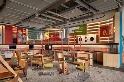 The outdoor seating area encourages relaxation with varied seating arrangements, including circular benches for spontaneous gatherings and skateboard-style stands, fostering an atmosphere of free-spirited ease.