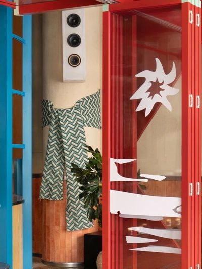 靠商场内的入口处为零售区,前方是使用蓝、红色的铝方管连接器加上万向轮组合而成的饰品区;后方的服饰区域,使用了两块呈45° 角度的冲浪板链接钢架作为衣架杆,加上吧台与吊柜延伸出来的收纳区域,再使用冲浪板形状的试衣镜,形成一个丰富多彩、轻松亲昵的零售氛围。
