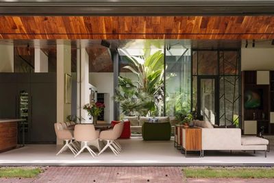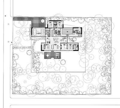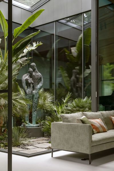 希望他们的房子能保持与周围大自然的联系,扎根于大地。因此,设计采用了玻璃结构,模糊了室内和室外的界限。在房屋的中心,建筑师设计了一个带有内庭院和可伸缩玻璃屋顶的中庭,使居民能够在屋内同时享受户外的天空。东西两侧有两个半庭院切入房体,将绿意引入室内。根据业主的要求,增加了一个