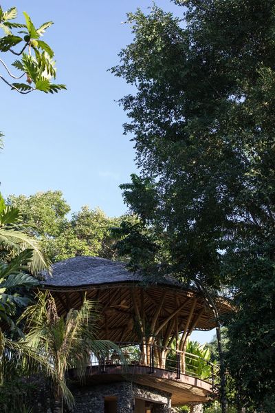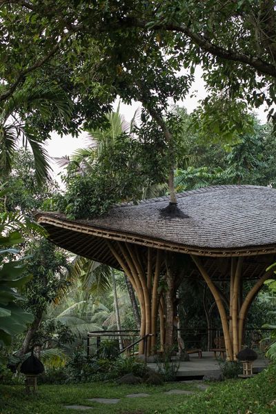 建筑采用现场发现的天然材料,如回收木材、竹子、火山石与手工赤陶,结构则围绕既有树木展开,随地势起伏,并向稻田的光线与宁静敞开。室内部分则与当地工匠紧密合作,所有家具与装置均为场地量身定制,使空间在自然与手工的对话中生长。