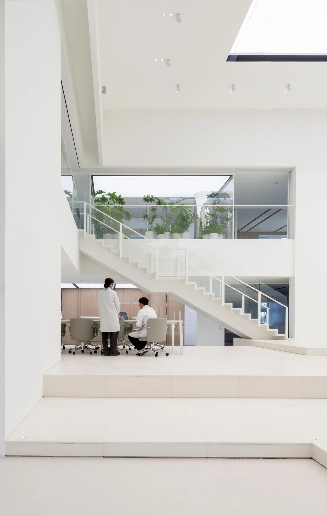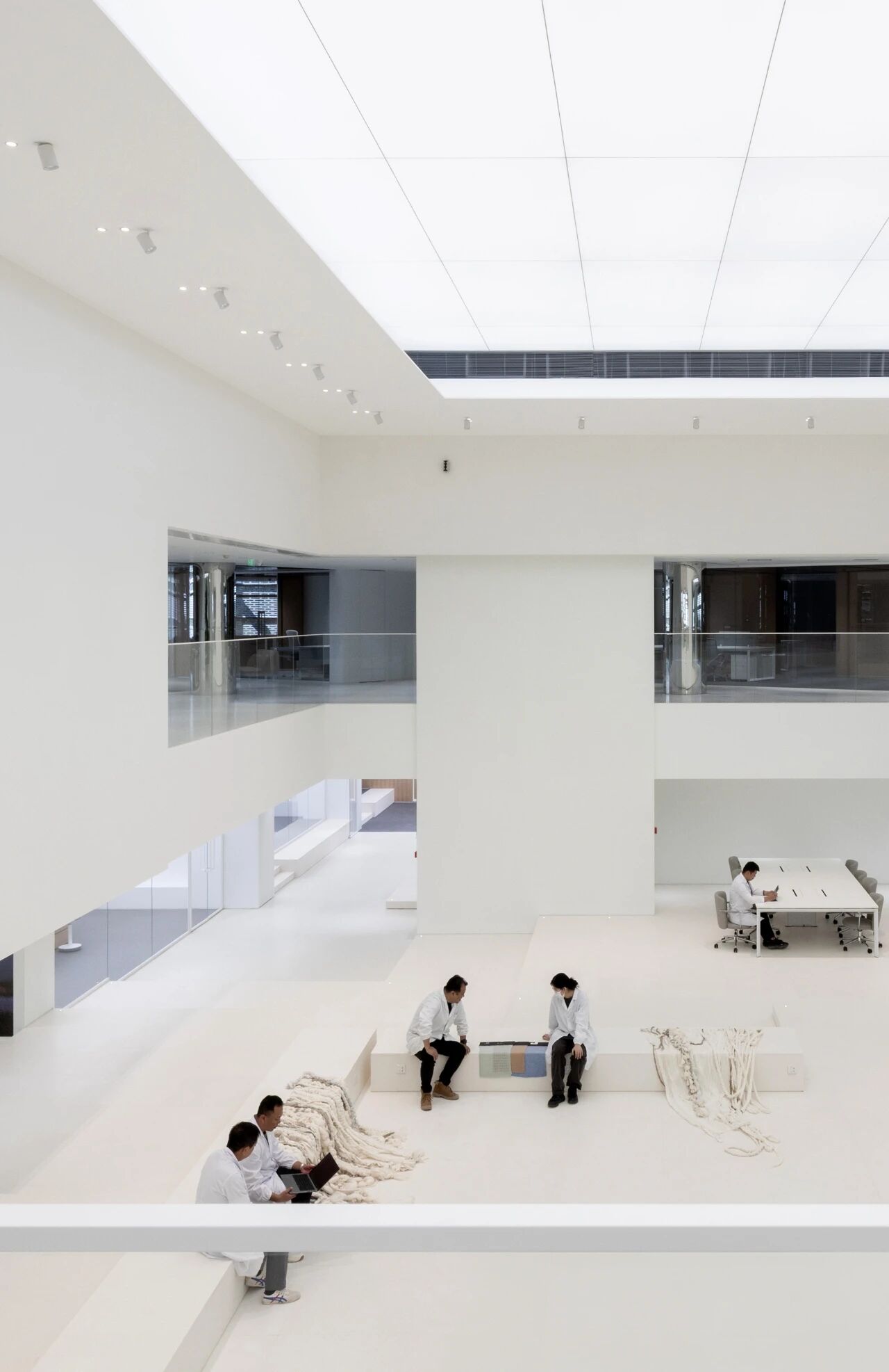 ”回字形”布局。在改造中,我们部分保留了这个特征,同时围绕中央庭院旋转并打开了多个区域。研发工作室、技术研究室、研发区域和样品库等关键功能空间被重新组织。我们用种植绿植的玻璃盒子在网格系统中旋转