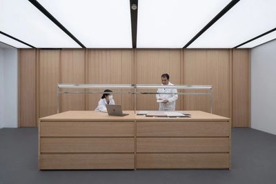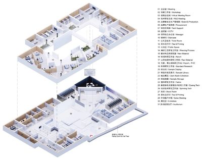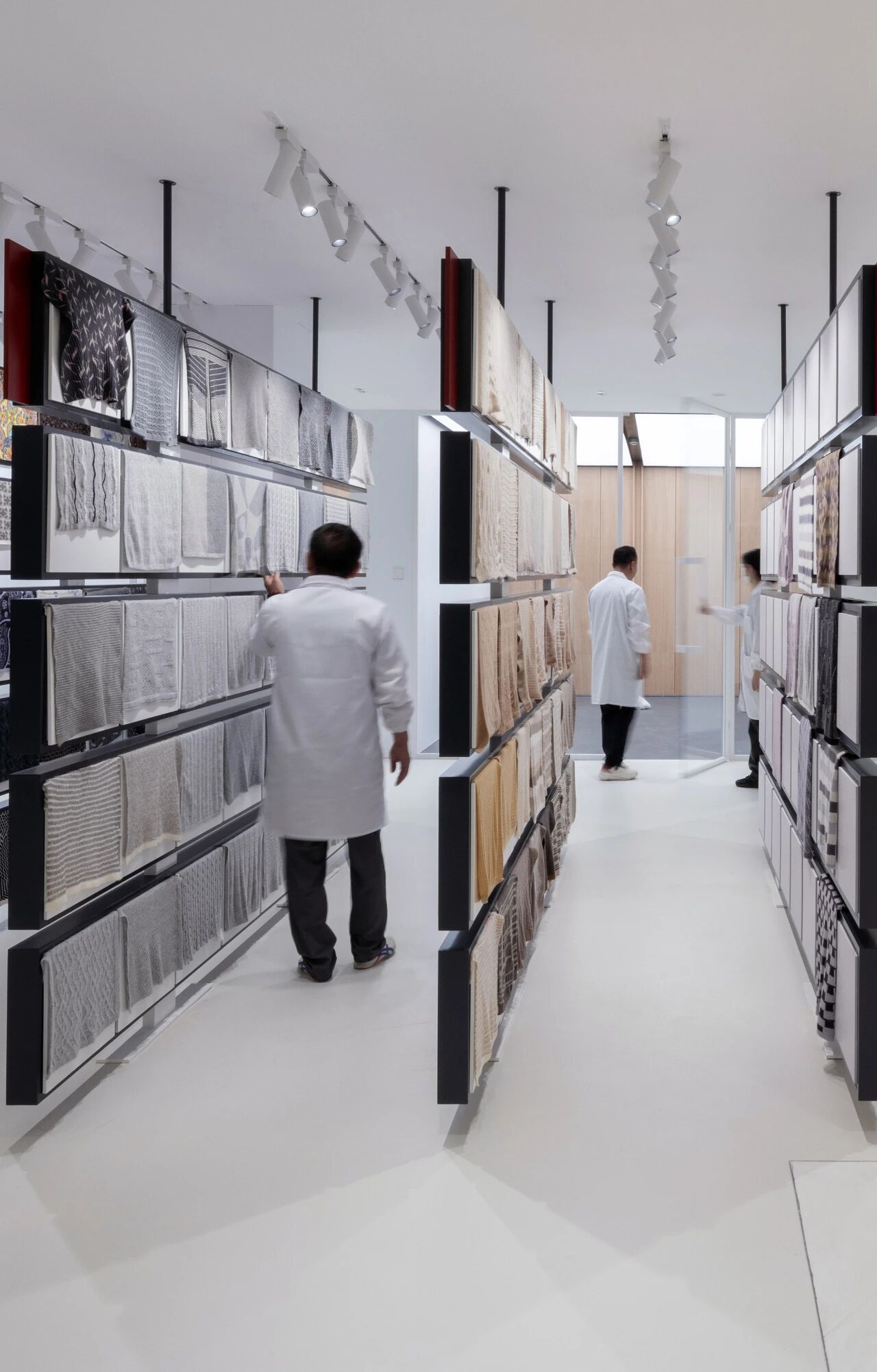 舍弃原始建筑中的中庭用作展示区的传统做法,我们更注重激发研发团队的创新活力。墙面和架上的样品不再是静态的展览品,而是可供随时取用、观摩的互动元素。通过将样品库重新定义为研讨空间,我们让产品研发过程变得更加开放透明。考虑到本地员工的工作习惯,我们将各工作室的样品间设置在面向公共中庭和走道的显眼位置,而将实际办公区安置在样品间后方,既保证了私密性,又让每个工位都能享受自然采光和室外景观。我们将演讲厅设计为与原有建筑网格呈