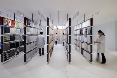 研发样品区采用工作台与垂直墙挂系统相结合的方式。在这里,材料样品不再是静态存储,而是被主动展示和使用的研发工具。这种布置方式促发了持续的原型讨论和设计评审,形成了一种以公共讨论为核心的新型工作方法。