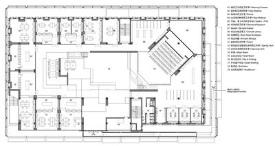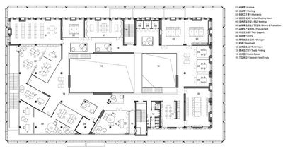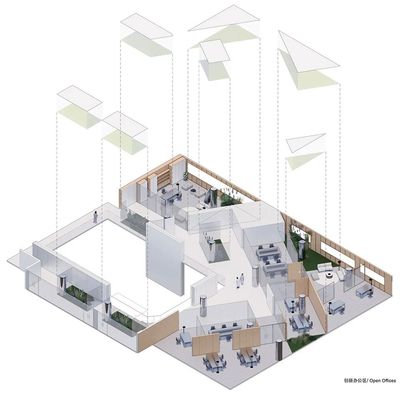 度,这一设计打破了传统的正交环路,创造出丰富的次级路径,让三层空间的流动更加自由。由此,各工作区之间的界限变得模糊,人们在流动的空间中获得了更多相遇和交流的机会。