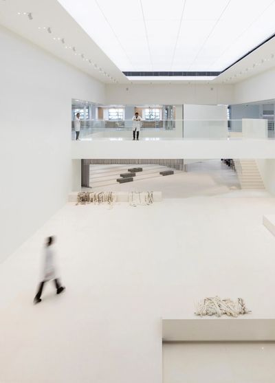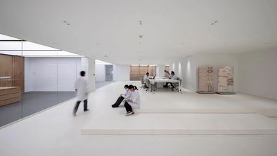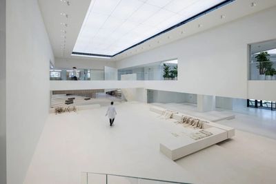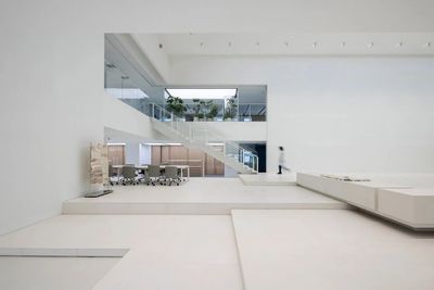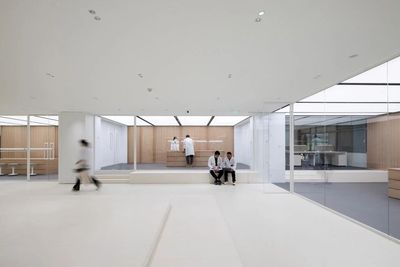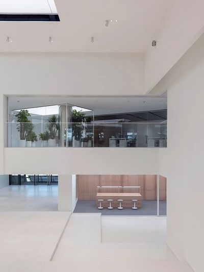 宽敞的中央接待空间承载着双重功能。这个通高的空间虽非专门的展厅,但其均匀的照明条件和开阔的场地完全适合举办大型项目展示,目的是营造一个开放的工作和讨论的场景。在这里展示不是目的,而是讨论的工具和信息交流的载体。周边设置的座椅既可供人休憩,也可兼作临时展台。八间不同组别的研发工作室以及其附属的材料库环绕在中庭的一侧,通过开敞讨论区与中庭实现软连接。