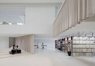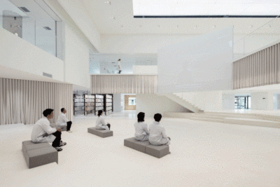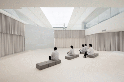 通过新建的连桥与主楼相连的演讲空间配备可升降的布帘隔断,能够适应从私密沙龙到大型讲座的不同需求。阶梯式座位提供灵活的座位安排,而上层廊道的观景平台让这里发生的活动成为整个空间的视觉焦点。当屏幕降下时,这里立即变身为专业研讨和集体学习的知识场域。