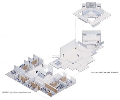 度角,这一布局强化了与材料库、样品区的空间对话。新建的空中连桥轻盈地跨越中庭,既在物理上分隔了演讲沙龙与主厅功能,又保持了视觉上的连通。新建的连桥上的观景平台更成为促进人们不期而遇的绝佳场所,同时也在物理空间中将演讲厅与中庭做了区域的分割同时又保持了视觉的交互和联系。