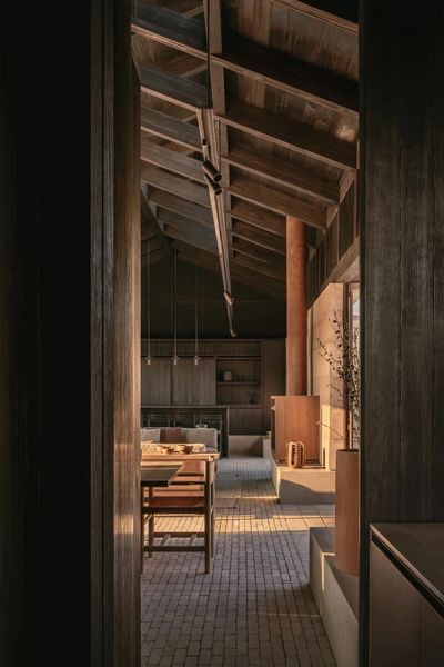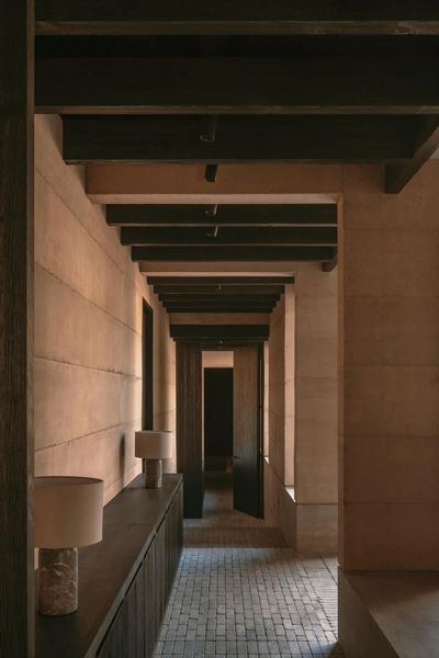 室内采用大地色系墙面,营造出静谧沉稳的氛围;脚下的灰色石材、深色木材与做旧金属材质相互搭配,共同构建出私密而内敛的环境。空间中没有浮夸的装饰,唯有经精心设计、旨在长久陪伴的克制之美。