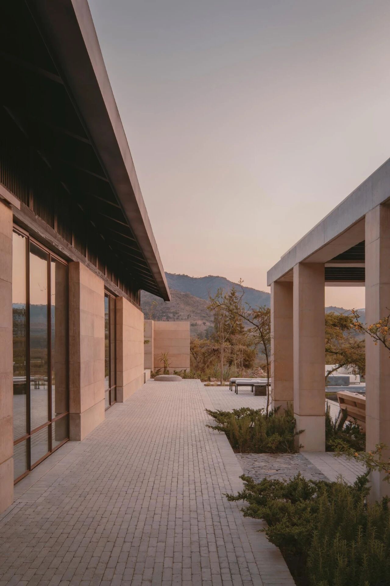 埃斯皮诺住宅(Casa el Espino)坐落于两座峡谷之间的缓坡之上,这两座峡谷将松树林与布拉沃谷(Valle de Bravo)的低地丛林相连。住宅低调地融入当地温暖干燥的环境中,其设计风格也因此呈现出简约而内敛的特质。该设计受环境与景观特征影响,采用舒缓的布局形式,整体为单层结构,并通过细微的标高调整,与地形保持和谐统一。