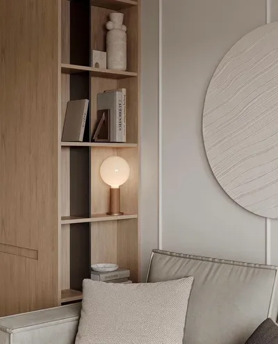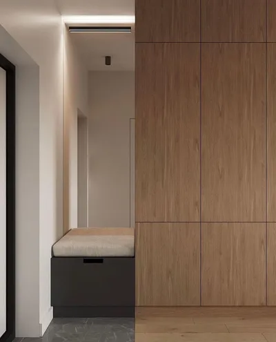 入口大厅以木质柜体与石质地面的碰撞开启质感序章,兼具储物功能的换鞋凳,让每一次归家都充满仪式感。