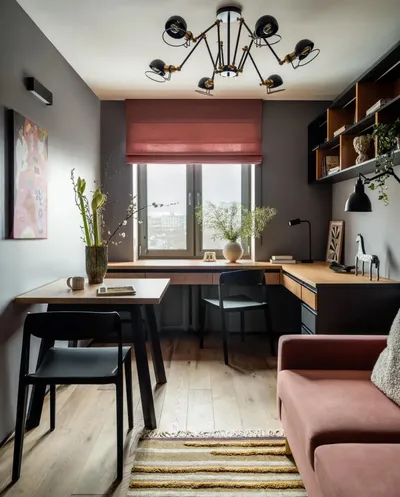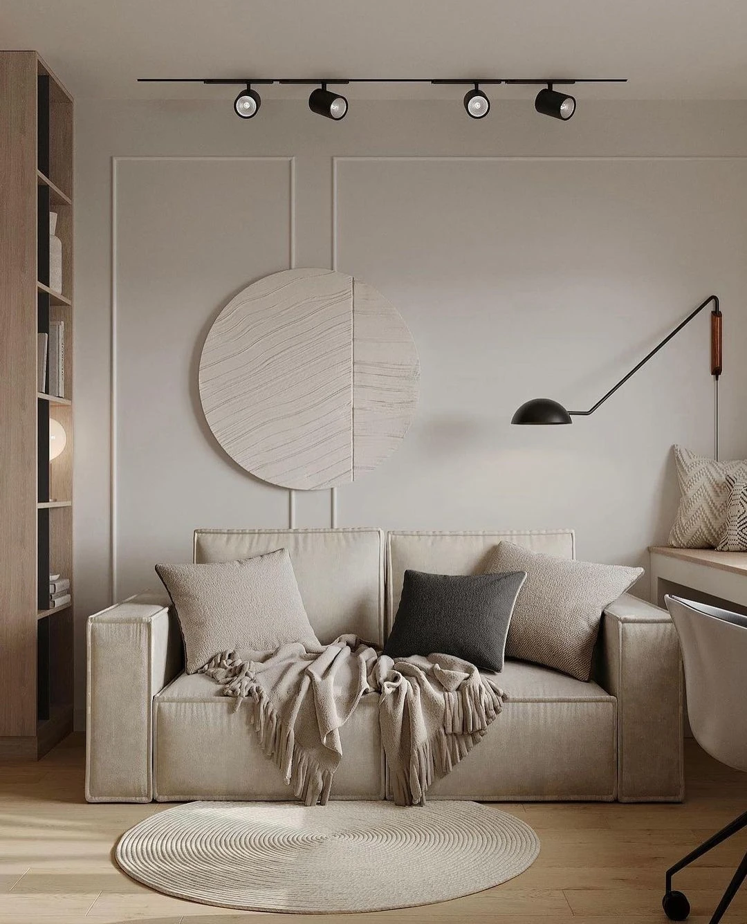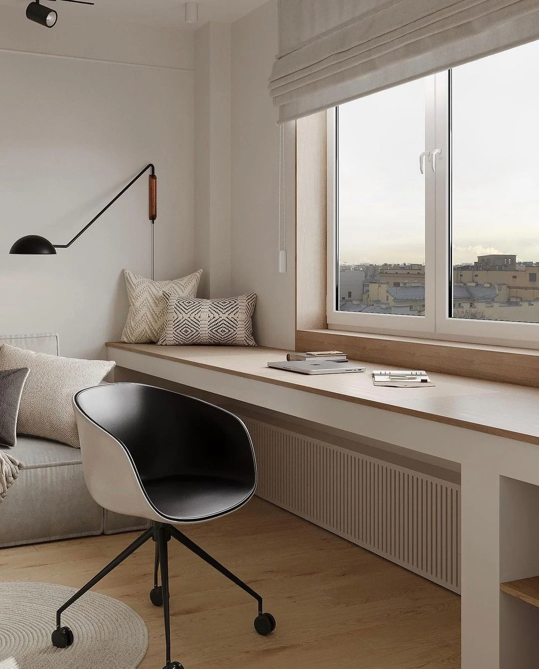 客厅与工作区的联动设计极具巧思,浅米色沙发搭配同色系编织地毯。靠窗的长形工作区,利用自然光营造舒适办公环境。
