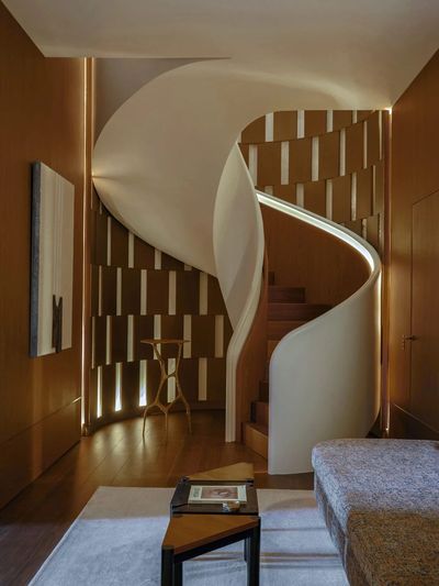 The sculptural staircase stands as the project’s defining feature. Crafted with the precision of boat builders, it reads as a flowing wooden ribbon connecting the two levels. “I love the idea of treating such a technical element with as much precision and detail, to make it both majestic and bold,” says Rodolphe.