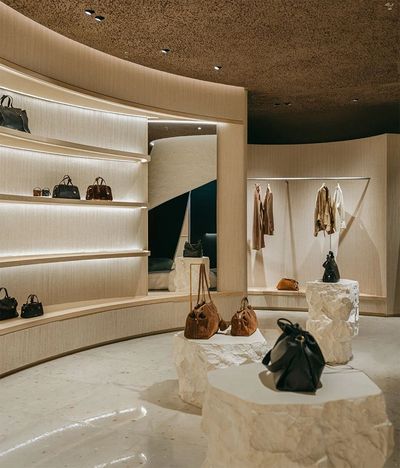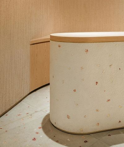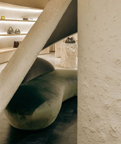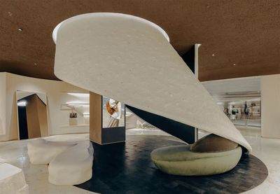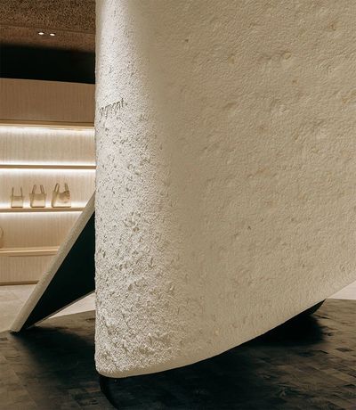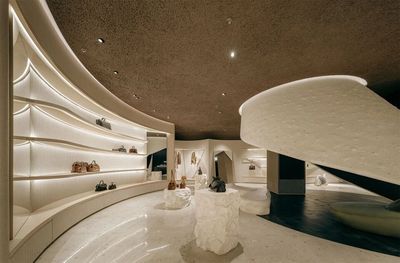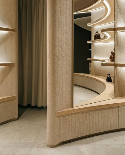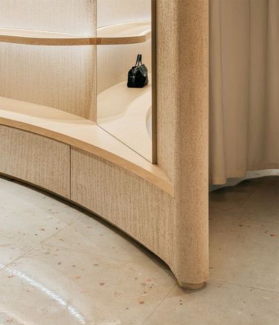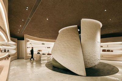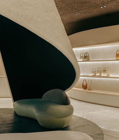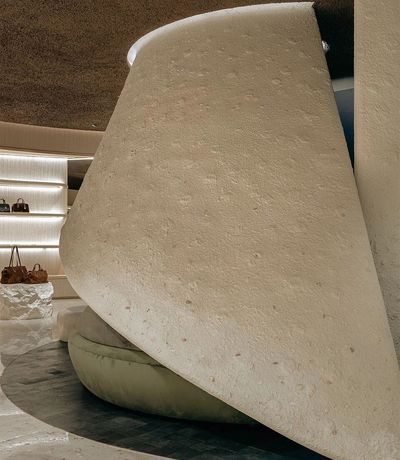 人可以从四面八方自由进入,但曲面墙体的高度与形状变化会自然引导人们在穿行时调整步态与姿态——或趋步,或侧身,或低头。结构柱也被包裹于此处,隐藏在嵌满贝壳的墙体之后,并成为固定LED屏的基座。结合特定的香氛与立体声场,零售区域的喧嚣会被短暂隔绝,这里更加安静亲密的空间氛围,就如同一个适合自己的包——在这个空间内,我们身体和心理上会得到某种保护。