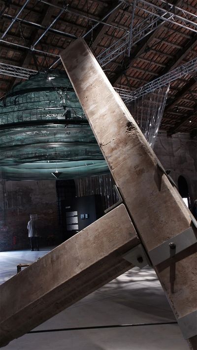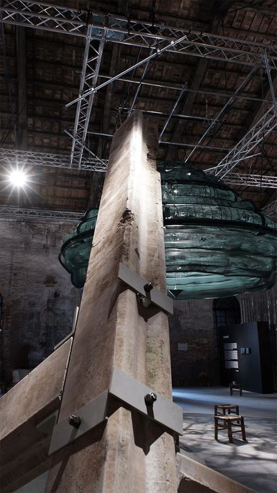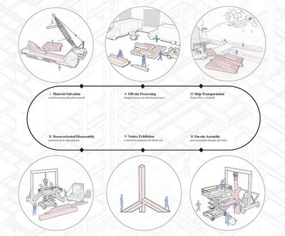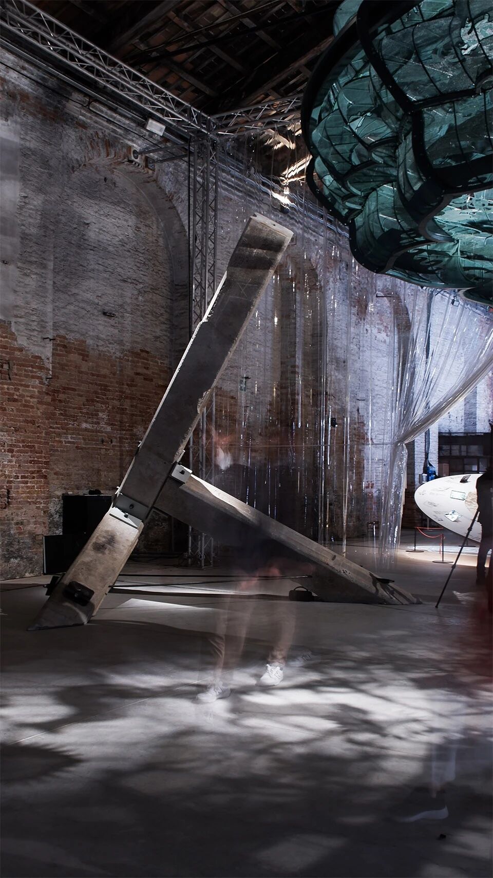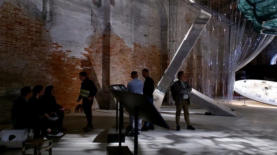 的再利用场景。装置来源于威尼斯当地的废旧混凝土,原为守护海堤的线性构件。经过数字建模、结构计算、现场处理之后,最终于展馆内完成最终的调试与安装。
