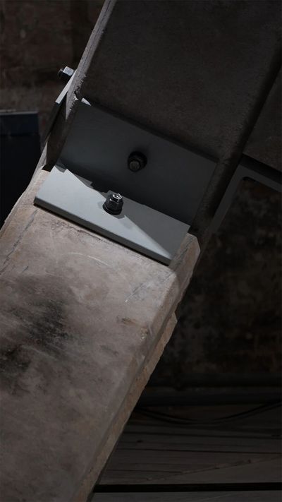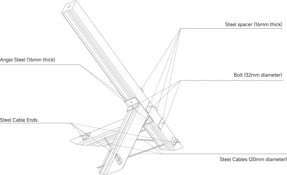 大,更加笨重的钢套筒连接件,而是转而采用轻质的角钢与钢板——这套策略为混凝土材料保留了其结构完整性和后续再用的结构潜力,又以轻盈灵动的衔接模式,建构出轻重交织,对比鲜明的美学特征。