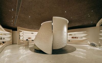 棱角分明的礁石形展台与圆润流畅的木质展架相互制衡,恰似礁石与海浪的一万次碰撞。嵌满贝壳的墙面粗粝原始,而釉面地坪光滑如镜,映出如水波纹般摇曳的倒影,在材质语言上强调着触感对比。