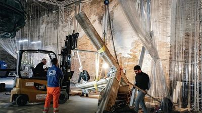 作为世界上最大的混凝土消费国,中国每年产生约 24 亿吨建筑与拆除废料。传统的混凝土再利用方式无法适应当代多变复杂的城市环境。由香港中文大学王帅中教授领导的结构平衡实验室创作的《废砼再生》装置,作为第19届威尼斯国际建筑双年展中国馆的十件作品之一,重新思考了废旧的混凝土“重生”的方式,将其视作可供重构的材料而非碎料,以及未来新建筑框架的组成部分。装置创造性地使用了来自威尼斯本地的废旧混凝土,设想了一个完全由废旧混凝土构成的全新的建造体系与工作流程,其核心在于保留原有构件的结构性能,并借助成熟的工业产品,与业界专业人士合作,来最大化拓展混凝土