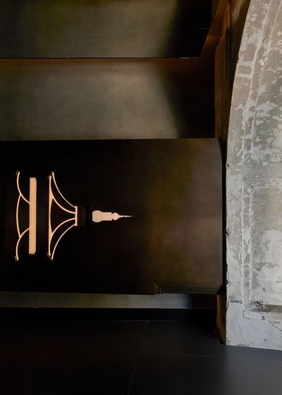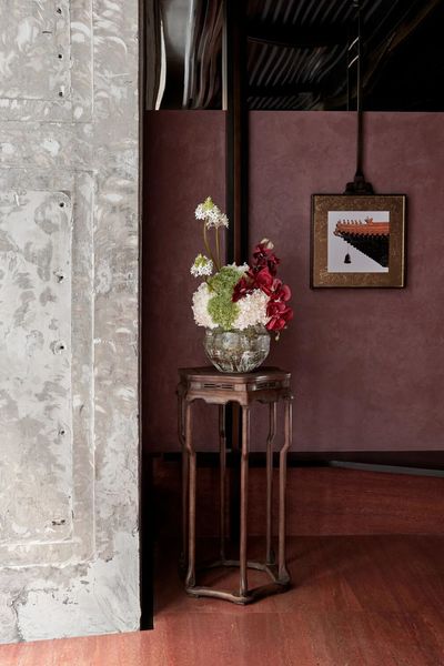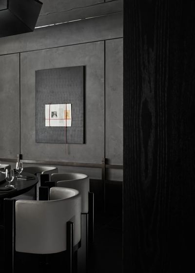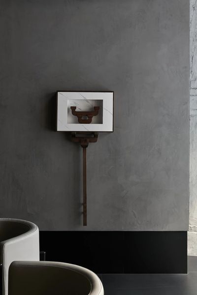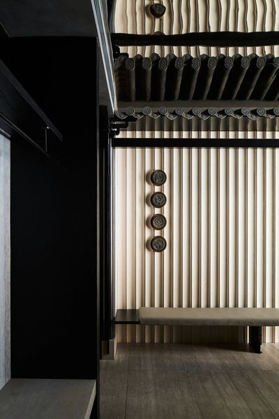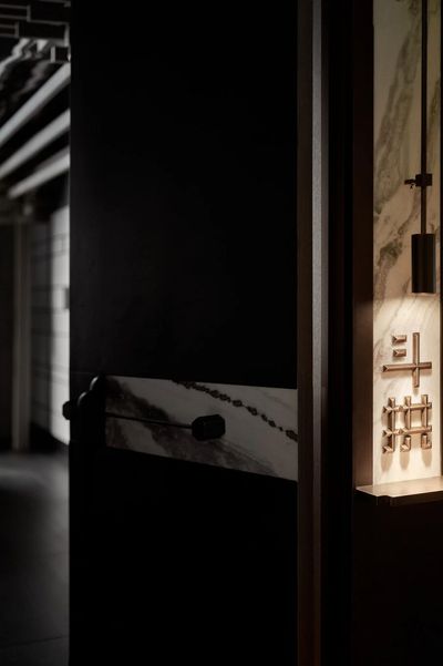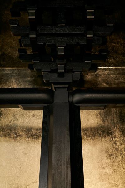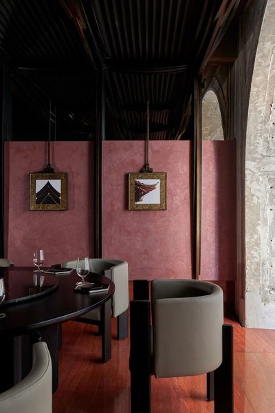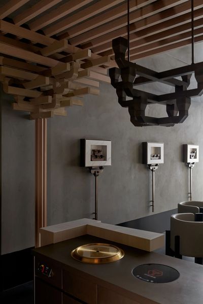 设计师将飞檐的榫卯节点重新解构,拆分为细部元素,再以当代的材料与工艺呈列在墙上。它们宛如艺术展厅中的展品,让人在用餐的间隙,可以细细体味古建结构的智慧与诗意。